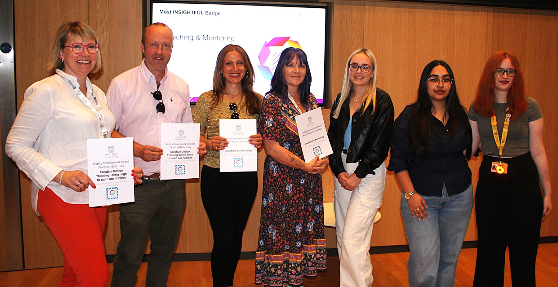 Staff winners(from left) Tina Scahill, Lecturer and creative facilitator in the Department of Design and Immersive Technologies, Steve Northam, Senior Lecturer in Entrepreneurship and Innovation, Manuela Pilato, Lecturer in Business and Event Management and Marie Haverly, Deputy Head of the Business School with students who nominated them