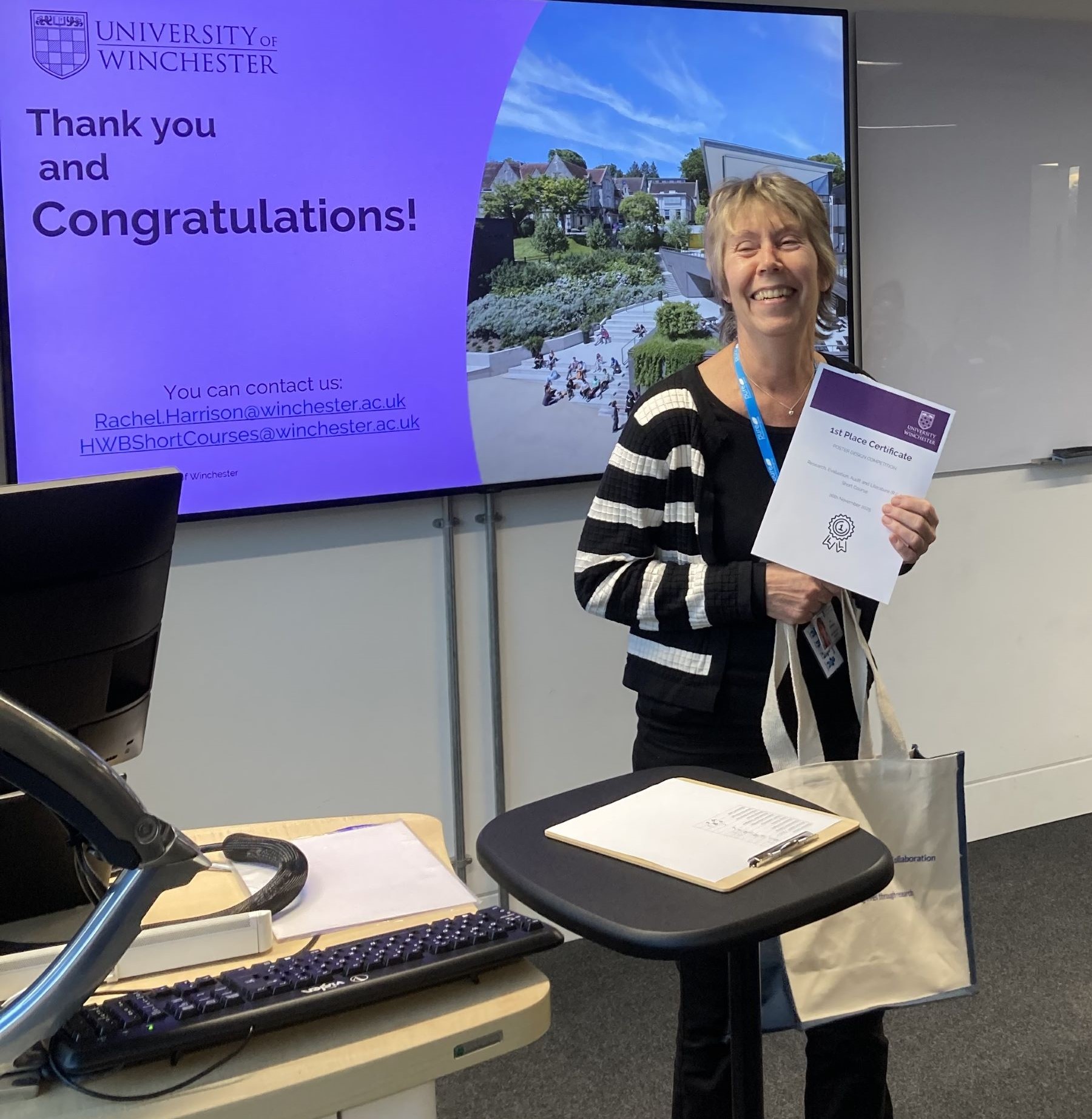 Mel Tomkings, an Occupational Therapist at Hampshire County Council (HCC), with her winning poster at the celebration event to mark the end of the first REAL (Research, Evaluation, Audit and Literature) course at the University of Winchester