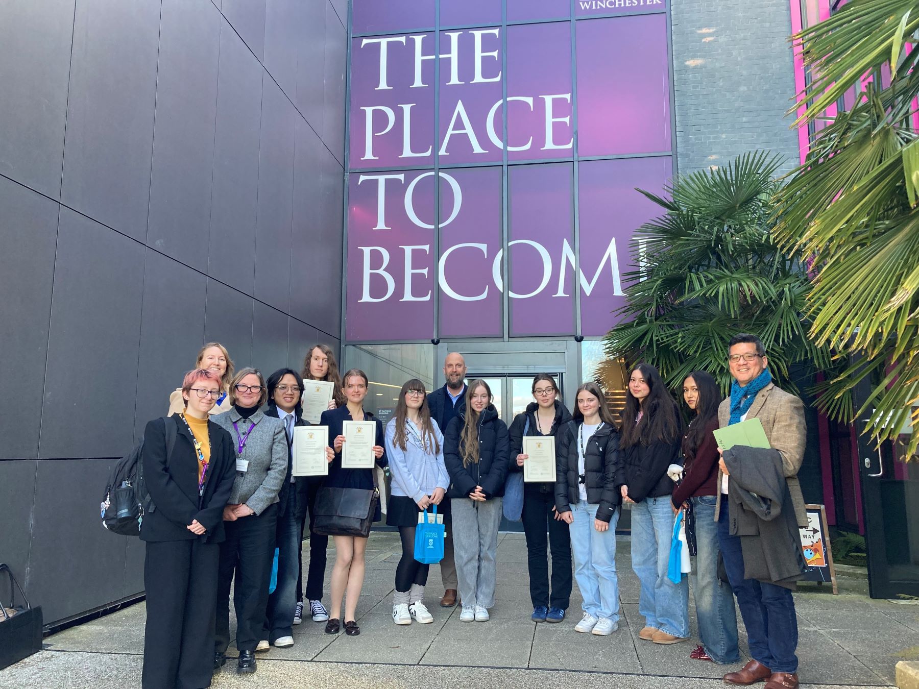 Pictured: Year 12s from Barton Peveril at the University of Winchester with their Deputy Principal, Nicola Carcone (third from left), and Director of Science, Dr Nathan Cheung (far right). Also pictured the University's Pro Vice-Chancellor Sam Jones (centre) and Dr Emma Nottingham, head of the School of Law (second from left).