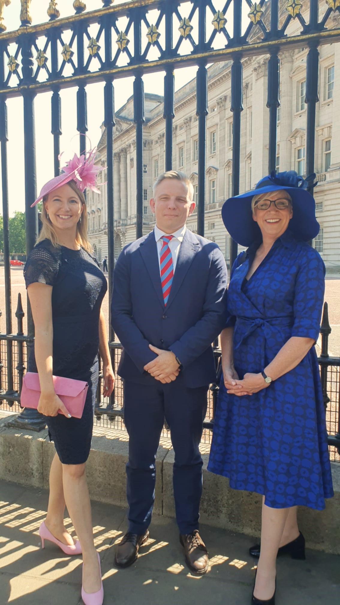 Pictured: Dr Emma Nottingham, Professor Emile Bojesen and Dr Laura Clarke, outside the gates of Buckingham Palace.