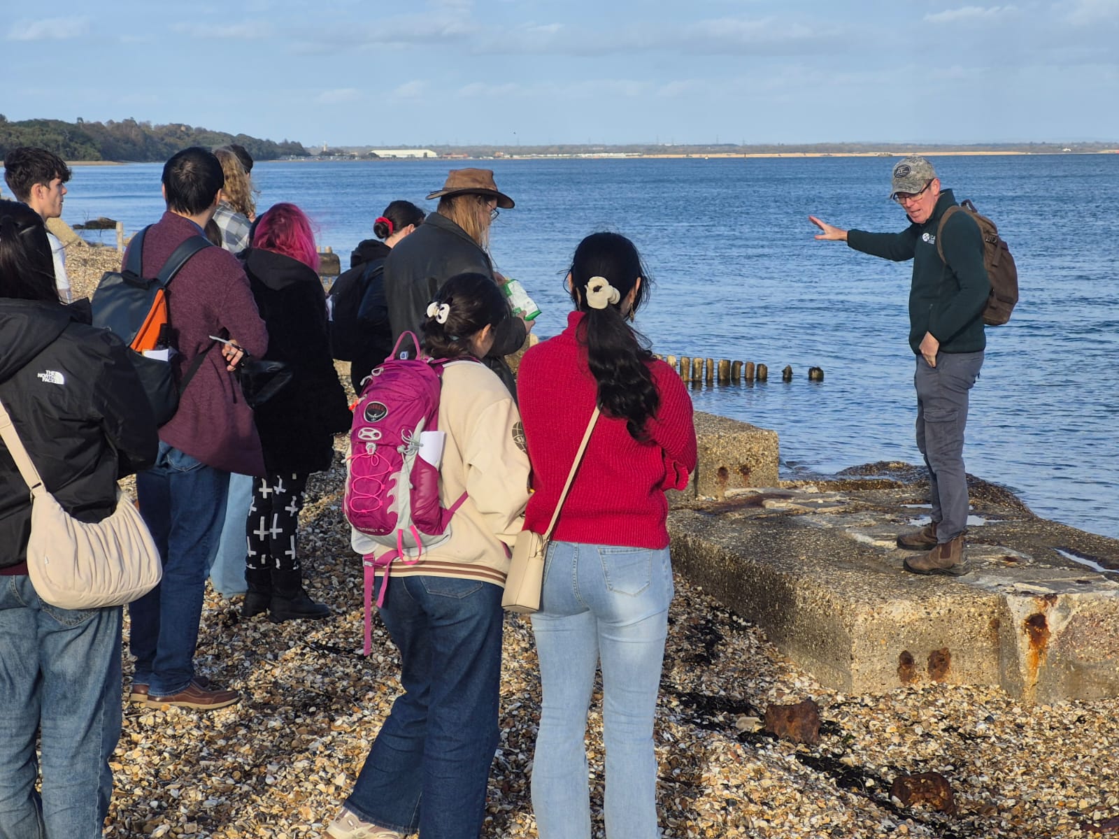 He is pictured with students from the University of Winchester studying the Battlefield Archaeology module at Lepe in the New Forest, where substantial visible remains of the structures used in the construction and launching of large concrete caissons, which formed part of the Mulberry Harbours used during the Allied invasion of Normandy.