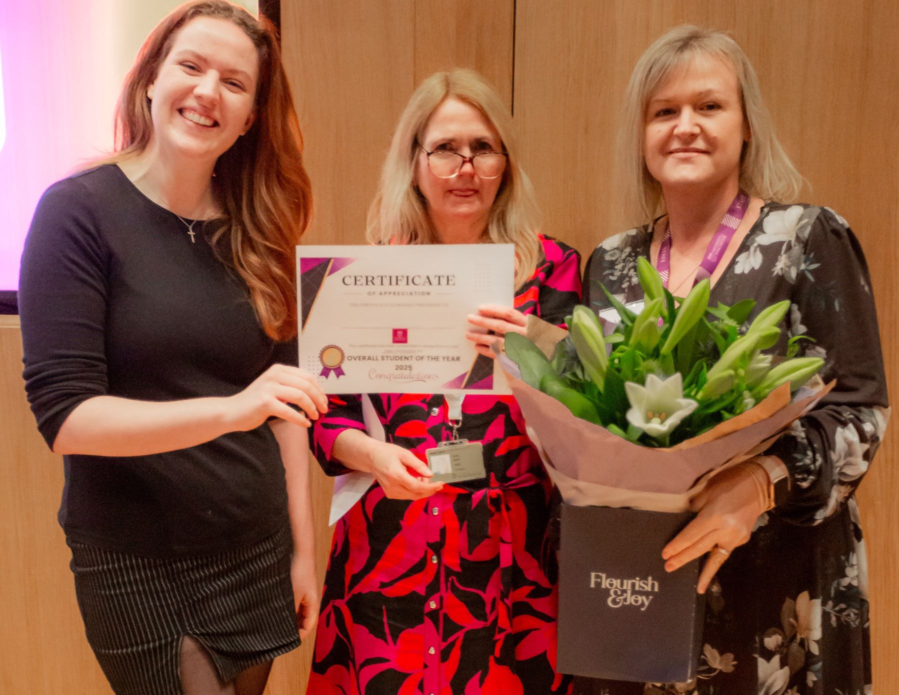 First year Student of the Year Beth Harris (left) receives her award from Dr Kate Nash, the University’s Lead Midwife for Education, and Lisa Cox Senior Lecturer in Midwifery.