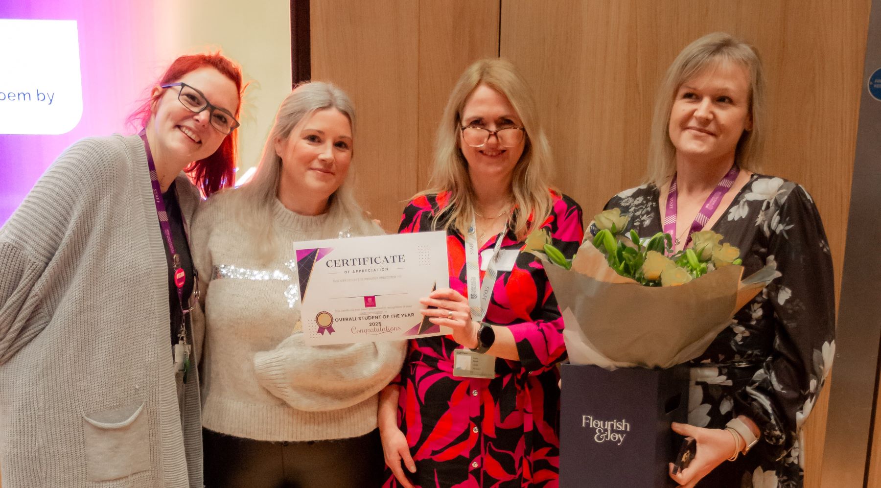 Second Year Student of the Year: Amy Blyth (second from left) with Vikki Pragnell, Senior Lecturer in Midwifery (left) and Dr Kate Nash, the University’s Lead Midwife for Education, and Lisa Cox Senior Lecturer in Midwifery.