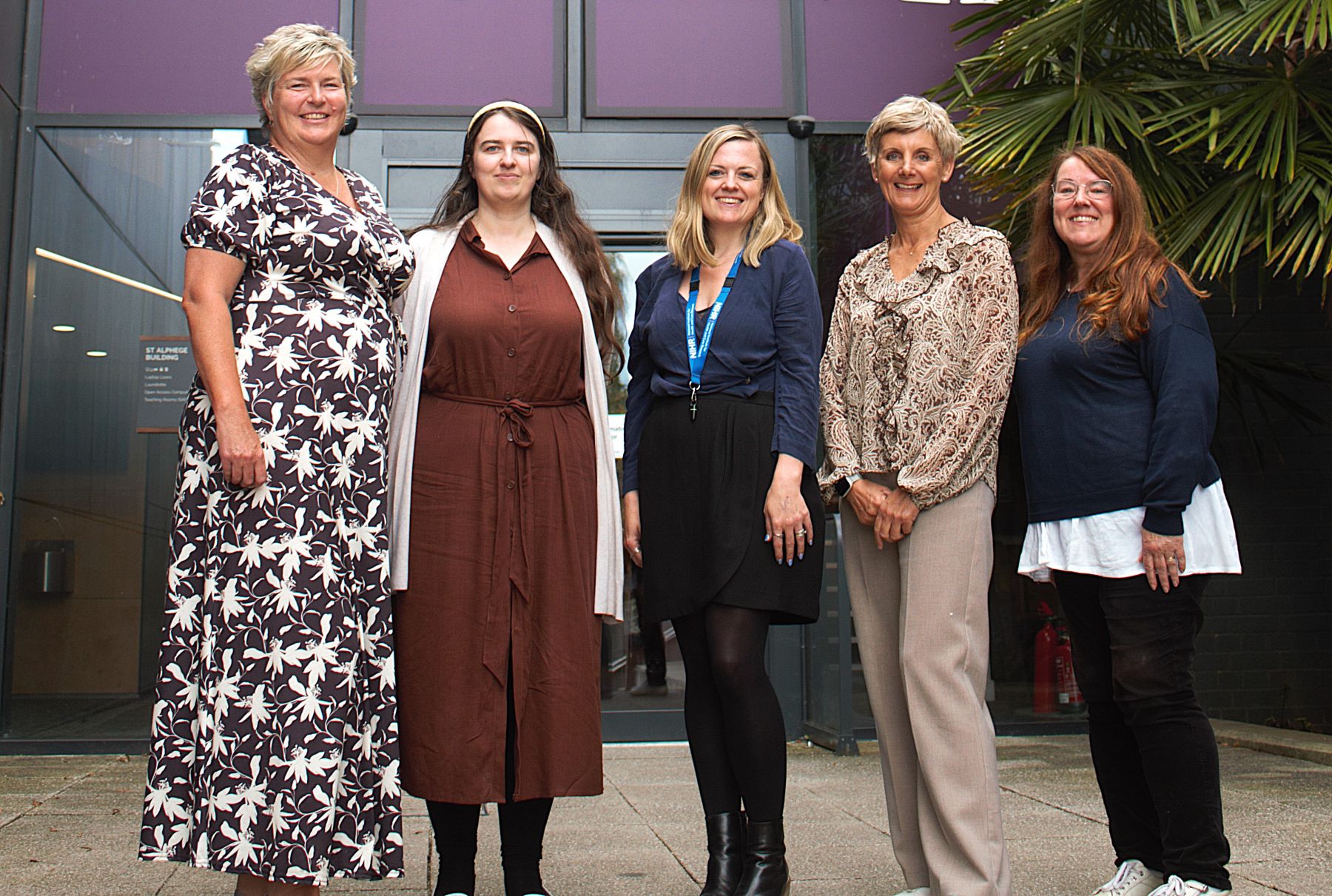 Pictured top (left to right): Dr Rachel Harrison, Senior Lecturer in Health and Social Care; Jennifer Crowdy, Technology Enhanced Learning Trainer and Developer; Amanda Pattie, NIHR Study Support Manager for Wider Settings; Elizabeth Ward-Davies, Dean of the Faculty of Health and Wellbeing; and Hazel Brown, Associate Dean.