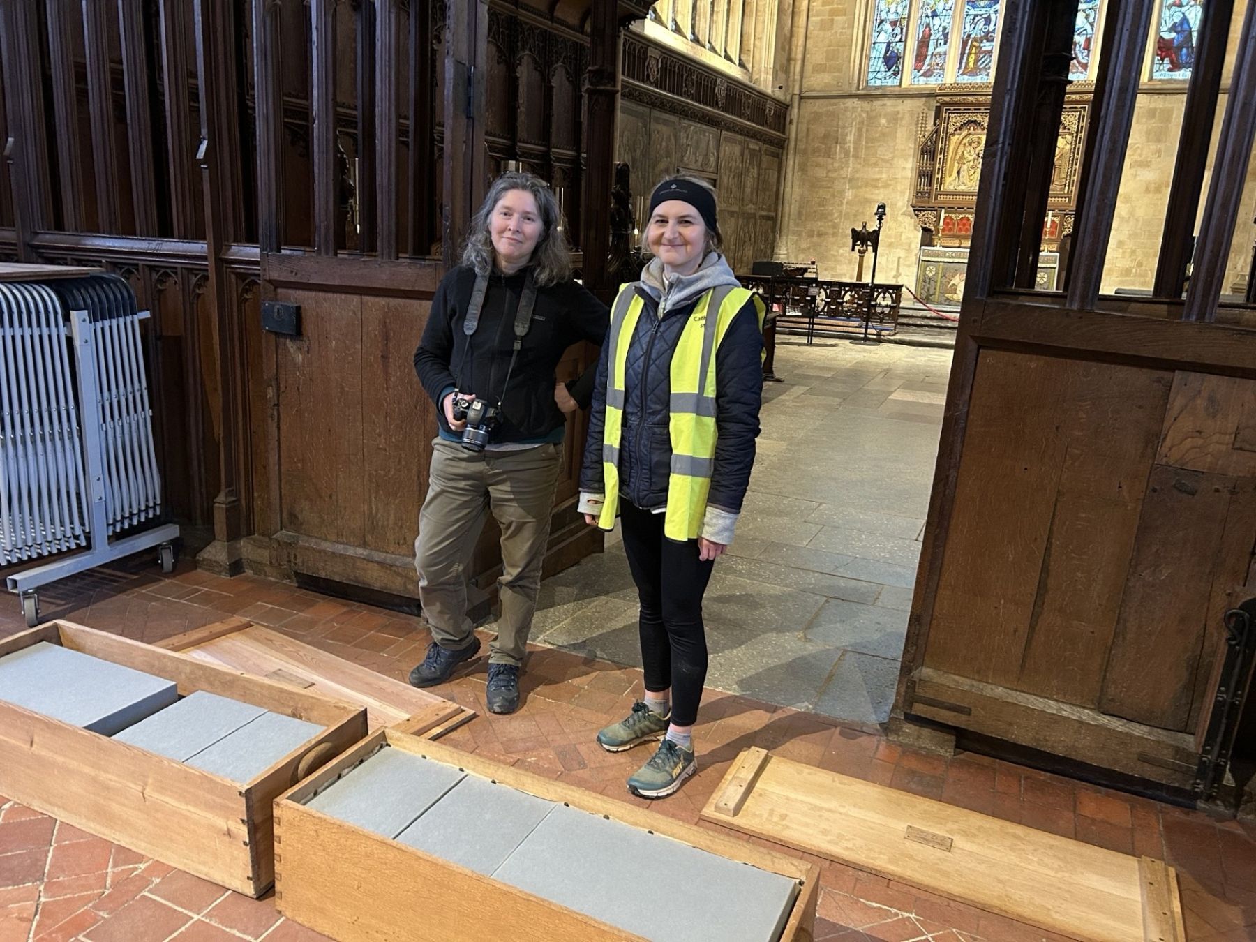 Dr Heidi Dawson-Hobbis, Senior Lecturer in Biological Anthropology at the University of Winchester, and Cathedral Curator Eleanor Swire with some of the wooden internal bone boxes