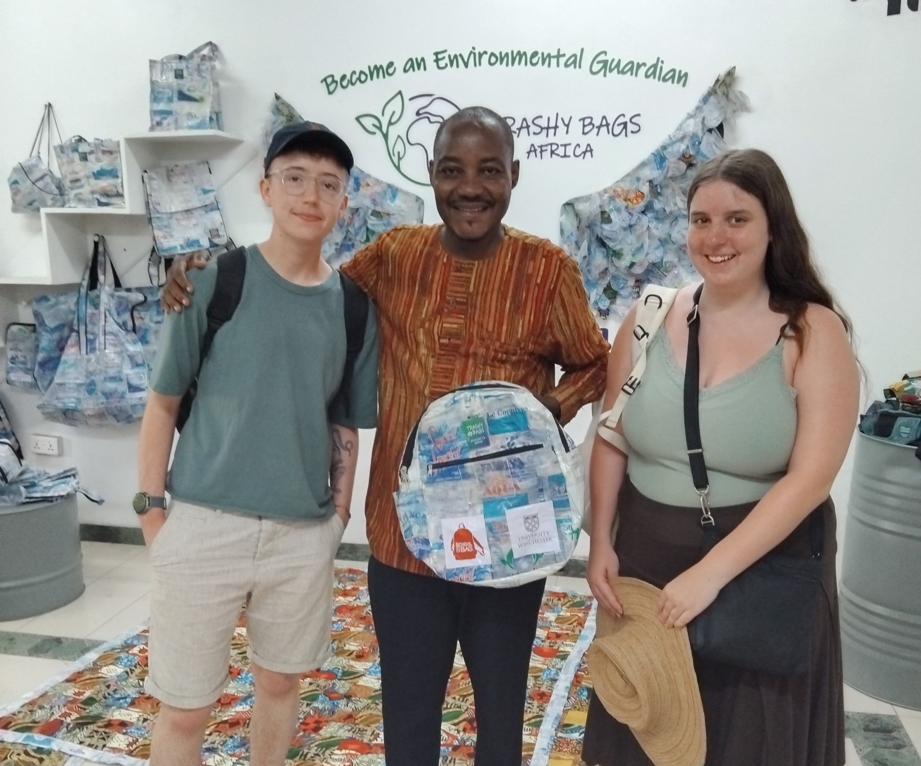 Pictured top: Students Arin Davidson and Ceri Evans with Elvis Eboluah, project manager at the Trashy Bags factory