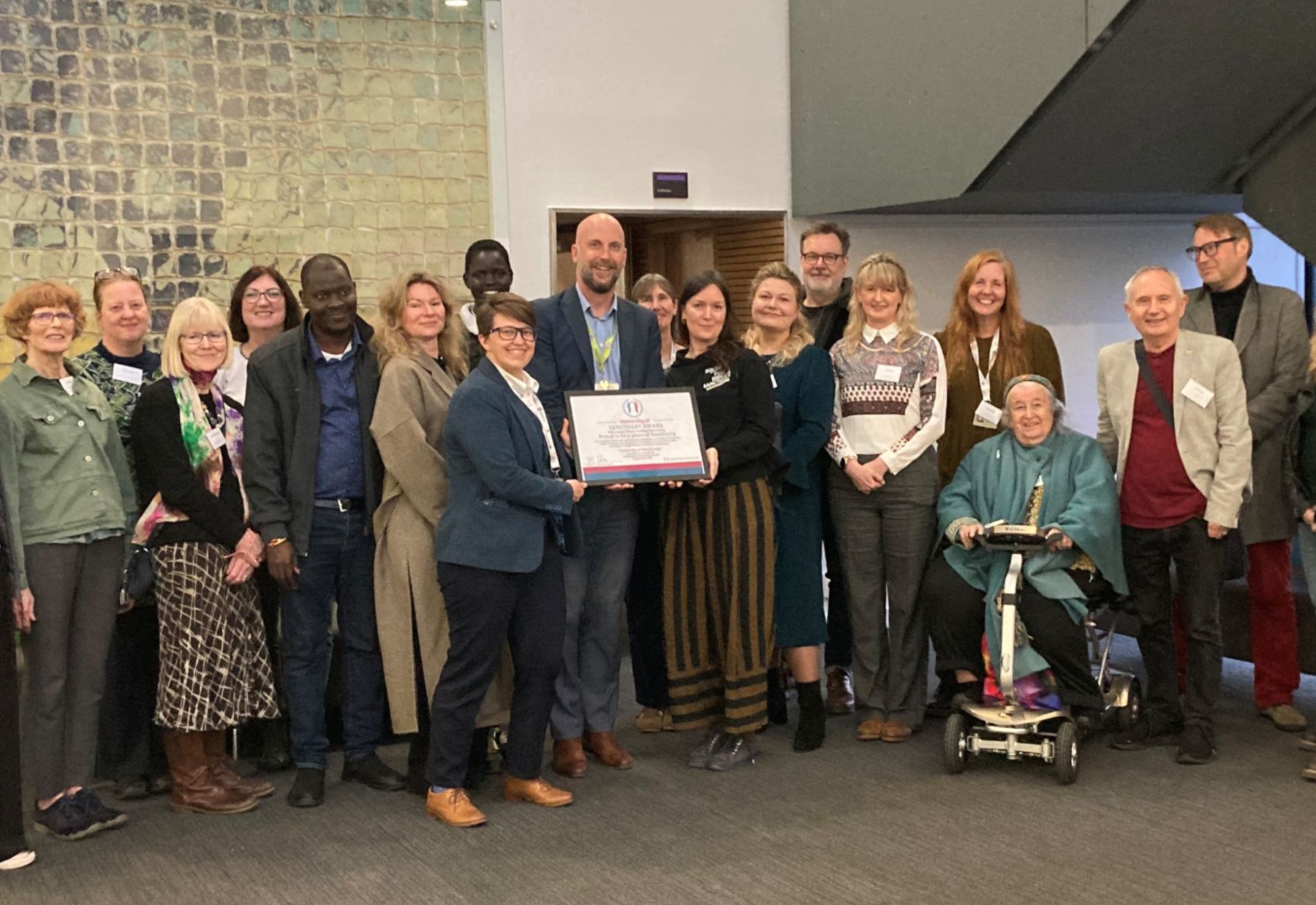 Pictured: Sarah Harder-Collins, Co-Chair of the University of Sanctuary Network, and Pro Vice-Chancellor Sam Jones accept the new Sanctuary Award from Elizabeth Flint, the chair of Winchester City of Sanctuary surrounded by others attending the Putting Sanctuary Values into Action event.