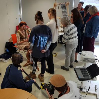 Background image: Historian Dr Carey Fleiner, a specialist in Roman and medieval textiles, demonstrating spinning and weaving at the event Spinning a Yarn: Fabric making, Identity, Language and Storytelling Through Time, part of the 2023 Being Human Festival, a national annual celebration of the Humanities.